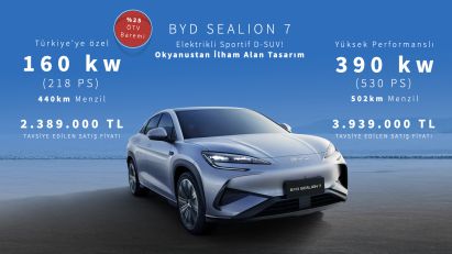 Dünyanın lider yeni enerji araç üreticisi BYD, Türkiye’de ürün gamını yüzde 100 elektrikli sportif D-SUV modeli BYD SEALION 7 ile genişletiyor. Türkiye’ye özel olarak geliştirilen 160 kW gücündeki arkadan itişli versiyonun yanı sıra, 390 kW gücündeki dört çeker seçeneğiyle öne çıkan BYD SEALION 7, Kasım ayı itibarıyla BYD bayilerinde yerini alacak. Modelin 160 kW’lık Design versiyonu 2.389.000 TL, 390 kW’lık Excellence donanım versiyonu ise 3.939.000 TL Kasım ayına özel lansman fiyatları ile satışa sunuluyor.