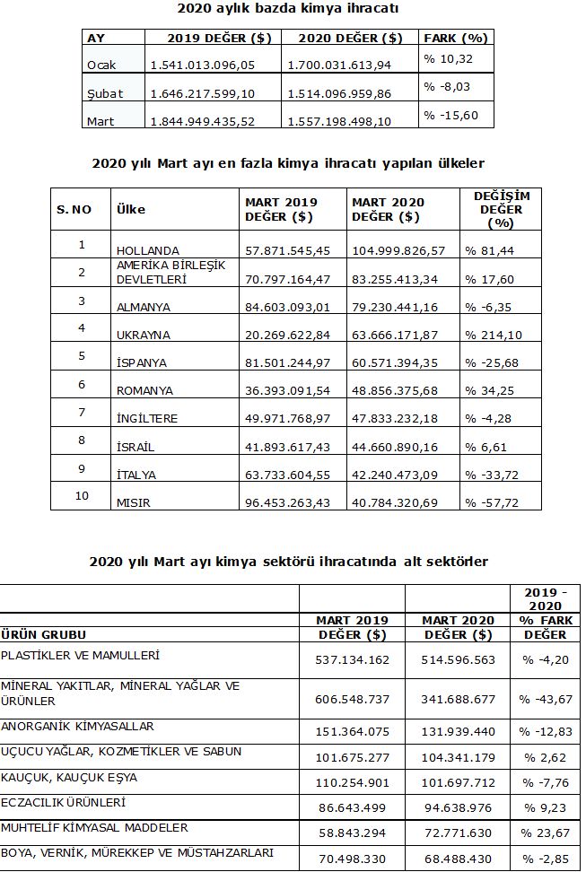 Haberler > Madeni Yağ Başlıkları Kimya sektörünün mart ayı ihracatı Şubat ayına göre yüzde 3 arttı![]() İstanbul Kimyevi Maddeler ve Mamulleri İhracatçıları Birliği (İKMİB) verilerine göre, kimya sektörü ihracatı 2020 yılı Mart ayında 1 milyar 557 milyon dolar olarak gerçekleşti. Kimya ihracatı geçen senenin Mart ayına göre yüzde 15,6 azalırken, bu yıl Şubat ayına göre yüzde 3 arttı. Sektörün üç aylık ihracatı ise 4 milyar 771 milyon dolara ulaştı. Sektörün Mart ayında en çok ihracat yaptığı ülke ise 104 milyon 999 bin dolarlık ihracat ile Hollanda oldu. Hollanda’yı takip eden ABD, 83 milyon 255 bin dolar ihracat ile ikinci sırada yer alırken, Almanya 79 milyon 230 bin dolar ihracat ile üçüncü sırada yer aldı.Mart ayı kimya sektörü ihracat rakamlarını değerlendiren İstanbul Kimyevi Maddeler ve Mamulleri İhracatçıları Birliği (İKMİB) Yönetim Kurulu Başkanı Adil Pelister, “Tüm dünyanın yaşadığı koronavirüs salgınının etkisini kimya sektörümüzde de görüyoruz. Mart ayında 1 milyar 557 milyon dolarlık kimya ihracatı gerçekleştirirken üç aylık kimya ihracatımız ise 4 milyar 771 milyon dolara ulaştı. Geçen seneye göre yüzde 15,6’lık bir azalma olurken bu yıl bir önceki aya baktığımızda yüzde 3’lük bir artış görüyoruz. Tüm olumsuzluklara rağmen ihracatımızı durdurmuyoruz ve Ticaret Bakanlığımızın önerileri doğrultusunda farklı lojistik kanallarımızı kullanmaya çalışıyoruz. Özellikle bu süreçte demiryolu, hava kargo taşımacılığı ve denizyolu daha fazla öne çıkıyor. Karayollarında ise temassız ticaret yapılıyor. Bu kritik dönemde önemli olan öncelikle insan sağlığı ve ülkemizin ihtiyaçları. Biz de İKMİB olarak bu doğrultuda hareket ediyoruz. Türkiye’nin ihracattaki ikinci büyük sektörü olan kimya sektörünün birliği İKMİB olarak elimizi taşın altına koyduk ve çatı kuruluşumuz Türkiye İhracatçılar Meclisi’nin başlattığı üretim seferberliği kapsamında 100 bin litre dezenfektanı TİM adına Sağlık Bakanlığımıza, hastanelerimize ve Türk Kızılayı’na teslim ettik. PAGDER iş birliği ile İKMİB olarak 100 bin adet sağlık siperini de Sağlık Bakanlığımıza teslim ediyoruz. Böyle dönemlerde milli dayanışmanın önemine inanıyoruz. Bu süreç bittiğinde kayıplarımızı telafi etmek ve ihracatımızı artırmak için daha çok çalışacağız. Ülkemizin ekonomisinin gelişmesi için kimya sektörü olarak üretmeye ve ihracata devam edeceğiz” dedi.Mart ayında en fazla ihracat yapılan ülke Hollanda olduHollanda, Mart ayında en çok ihracat yapılan ülke oldu. Mart ayında Hollanda’yı takip eden ilk onda yer alan diğer ülkeler ise ABD, Almanya, Ukrayna, İspanya, Romanya, İngiltere, İsrail, İtalya ve Mısır oldu.Hollanda’ya yapılan kimya ihracatı 2020 yılı Mart ayında 104 milyon 999 bin dolar olarak gerçekleşti. Mart ayında Hollanda’ya en çok “mineral yakıtlar, mineral yağlar ve ürünleri”, “plastikler ve mamulleri”, “uçucu yağlar, kozmetikler ve sabun”, “kauçuk, kauçuk eşya”, “anorganik kimyasallar”, “muhtelif kimyasal maddeler” ve “yıkama müstahzarları” ihraç edildi.2020 yılı Ocak-Mart olarak üç aylık dönemde en çok kimya ihracatı yapılan ülkeler ise sırasıyla Hollanda, İtalya, Almanya, Irak, ABD, Belçika, İspanya, Mısır, İngiltere ve İsrail olarak ilk onda yer aldı.Mart ayında en çok “plastikler ve mamulleri” ihracatı gerçekleştirildiMart ayında kimyevi maddeler ve mamulleri ürün gruplarında plastikler ve mamulleri ihracatı, 514 milyon 596 bin 563 dolarla kimya ihracatında ilk sırada yer aldı. İkinci sırada 341 milyon 688 bin 677 dolarlık ihracatla mineral yakıtlar, mineral yağlar ve ürünler yer alırken, anorganik kimyasallar ihracatı 131 milyon 939 bin 440 dolarla üçüncü sırada yer aldı. Anorganik kimyasalları takiben ilk onda yer alan diğer sektörler ise; ‘uçucu yağlar, kozmetikler ve sabun’, ‘kauçuk, kauçuk eşya’, ‘eczacılık ürünleri’, ‘muhtelif kimyasal maddeler’, ‘boya, vernik, mürekkep ve müstahzarları’, ‘yıkama müstahzarları’ ve ‘organik kimyasallar’ oldu. |