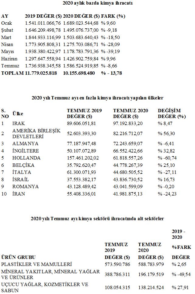 Haberler > Madeni Yağ Başlıkları 7 aylık kimya ihracatı 10 milyar doları aştı![]() İstanbul Kimyevi Maddeler ve Mamulleri İhracatçıları Birliği (İKMİB) verilerine göre, kimya sektörü ihracatı 2020 yılı Temmuz ayında geçen sene aynı döneme göre yüzde 8,5 gerilerken, bu yıl Haziran ayına göre yüzde 11 artarak 1 milyar 586 milyon dolar olarak gerçekleşti. Sektörün 7 aylık ihracatı ise 10,15 milyar dolara ulaştı. Irak, ABD ve Almanya en çok kimya ihracatı yapılan ilk üç ülke oldu.Temmuz ayı kimya sektörü ihracat rakamlarını değerlendiren İstanbul Kimyevi Maddeler ve Mamulleri İhracatçıları Birliği (İKMİB) Yönetim Kurulu Başkanı Adil Pelister, “Kimya sektörümüzün Temmuz ayında gerçekleştirdiği ihracat yaklaşık 1,6 milyar dolar oldu. Haziran ayına göre de yüzde 11 artış gerçekleştirildi. Sektörümüzün yedi aylık ihracatı ise 10 milyar doları aştı. Yedi aylık dönemde de ikinci sektör olmayı başardık. Temmuz ayında ABD, hem ikinci ülke olarak hem de ilk 10 ülke içinde yüzde 56,30 ile en çok artış sağlayan ülke olarak öne çıkıyor. Özellikle Latin Amerika bölgesinde sektörümüze yönelik fırsatlar var. İKMİB olarak düzenlediğimiz ticaret heyetleri ile bu fırsatlardan yararlanmaları için ihracatçılarımızı satın almacılarla buluşturuyoruz. Gelecek için ülkemize ve sektörümüze yönelik umudumuz ve beklentimiz pozitif. Ekonomik göstergeler de bu umudumuzu artırıyor. Bizler de üzerimize düşen sorumluluğun bilinciyle var gücümüzle çalışmaya devam ediyoruz. Sektörümüzün pandemi sonrasında oluşacak talebi karşılamak adına hazır olması gerekiyor. Dolayısıyla, dijital dönüşüm ilkeleri doğrultusunda yüksek katma değerli ürün yatırımlarına öncelik vermeliyiz. Devletimizin de kimya sektörümüzde yapılacak yatırımlarda teşvik ve destek vermelerini bekliyoruz” dedi.Temmuz ayında en fazla ihracat yapılan ülke Irak olduIrak, Temmuz ayında en çok ihracat yapılan ülke oldu. Temmuz ayında Irak’ı takip eden ilk onda yer alan diğer ülkeler ise ABD, Almanya, İngiltere, Hollanda, Belçika, İtalya, İsrail, Romanya ve İran oldu.Irak’a yapılan kimya ihracatı 2020 yılı Temmuz ayında 97 milyon 192 bin dolar olarak gerçekleşti. Temmuz ayında Irak’a en çok “plastikler ve mamulleri”, “uçucu yağlar, kozmetikler ve sabun”, “eczacılık ürünleri”, “yıkama müstahzarları”, “boya, vernik, mürekkep ve müstahzarları”, “muhtelif kimyasal maddeler”, “mineral yakıtlar, mineral yağlar ve ürünler”, “gübreler”, “yapıştırıcılar, tutkallar, enzimler” ve “anorganik kimyasallar” ihraç edildi.2020 yılı Ocak-Temmuz olarak yedi aylık dönemde en çok kimya ihracatı yapılan ülkeler ise sırasıyla Hollanda, Almanya, Irak, İtalya, ABD, İngiltere, İspanya, İsrail, Romanya ve Belçika olarak ilk onda yer aldı.Temmuz ayında en çok “plastikler ve mamulleri” ihracatı gerçekleştirildiTemmuz ayında kimyevi maddeler ve mamulleri ürün gruplarında plastikler ve mamulleri ihracatı, 588 milyon 783 bin 979 dolarla kimya ihracatında ilk sırada yer aldı. İkinci sırada 196 milyon 179 bin 519 dolarlık ihracatla mineral yakıtlar, mineral yağlar ve ürünler yer alırken, uçucu yağlar, kozmetikler ve sabun ihracatı 138 milyon 214 bin 524 dolarla üçüncü sırada yer aldı. Uçucu yağlar, kozmetikler ve sabunu takiben ilk onda yer alan diğer sektörler ise; ‘anorganik kimyasallar’, ‘eczacılık ürünleri’, ‘kauçuk, kauçuk eşya’, ‘muhtelif kimyasal maddeler’, ‘boya, vernik, mürekkep ve müstahzarları’, ‘yıkama müstahzarları’ ve ‘organik kimyasallar’ oldu. |