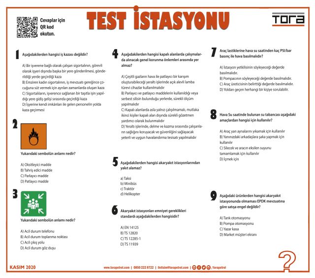 Her zaman olduğu gibi Tora Petrol yetkilileri tarafından hazırlanıp, Haber Ekonomi Gazetesi’nde yayınlanmaya devam eden “TEST İSTASYONU”nun 34.sü Kasım sayısında yayınlandı. 9 sorudan oluşan TEST İSTASYONU’nun cevap anahtarı Tora Petrol’ün web sitesinde.