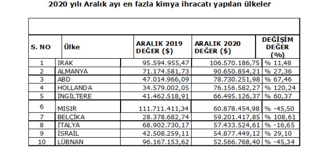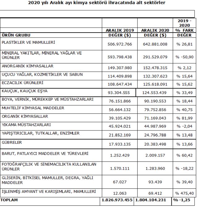 Aralık ayında alt sektörlerde en çok ihracat artışı yüzde 81,99 ile organik kimyasallar sektöründe olurken en fazla daralma ise yüzde 50,90 ile mineral yakıtlar, mineral |