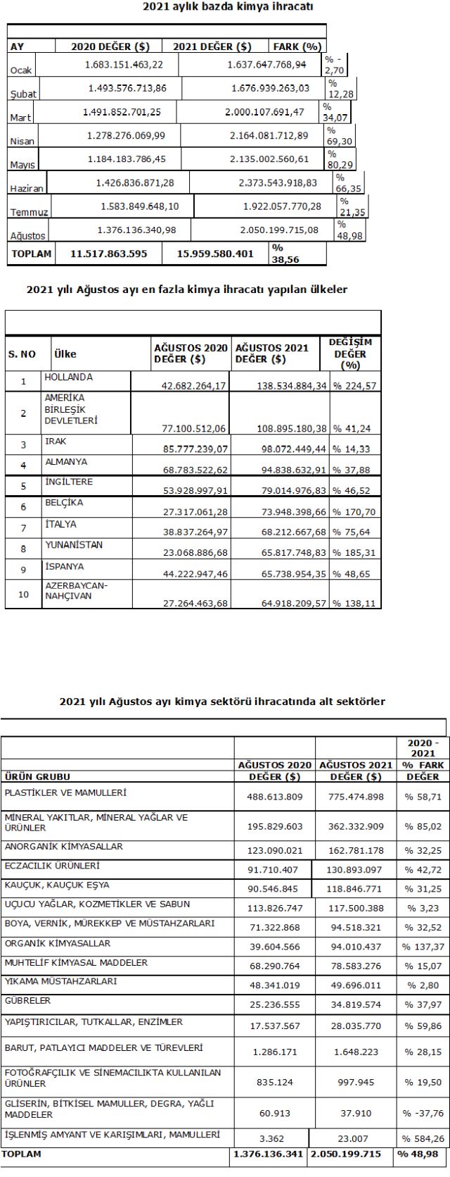 Ağustos ayında kimyevi maddeler ve mamulleri ürün gruplarında plastikler ve mamulleri ihracatı, 775 milyon 474 bin dolarla kimya ihracatında ilk sırada yer aldı. İkinci sırada 362 milyon 332 bin dolarlık ihracatla mineral yakıtlar, mineral yağlar ve ürünler yer alırken, anorganik kimyasallar ihracatı 162 milyon 781 bin dolarla üçüncü sırada yer aldı. ‘Anorganik kimyasallar’ı takiben ilk onda yer alan diğer sektörler ise; ‘eczacılık ürünleri’, ‘kauçuk, kauçuk eşya’, ‘uçucu yağlar, kozmetikler ve sabun’, ‘boya, vernik, mürekkep ve müstahzarları’, ‘organik kimyasallar’, ‘muhtelif kimyasal maddeler’ ve ‘yıkama müstahzarları’ oldu.