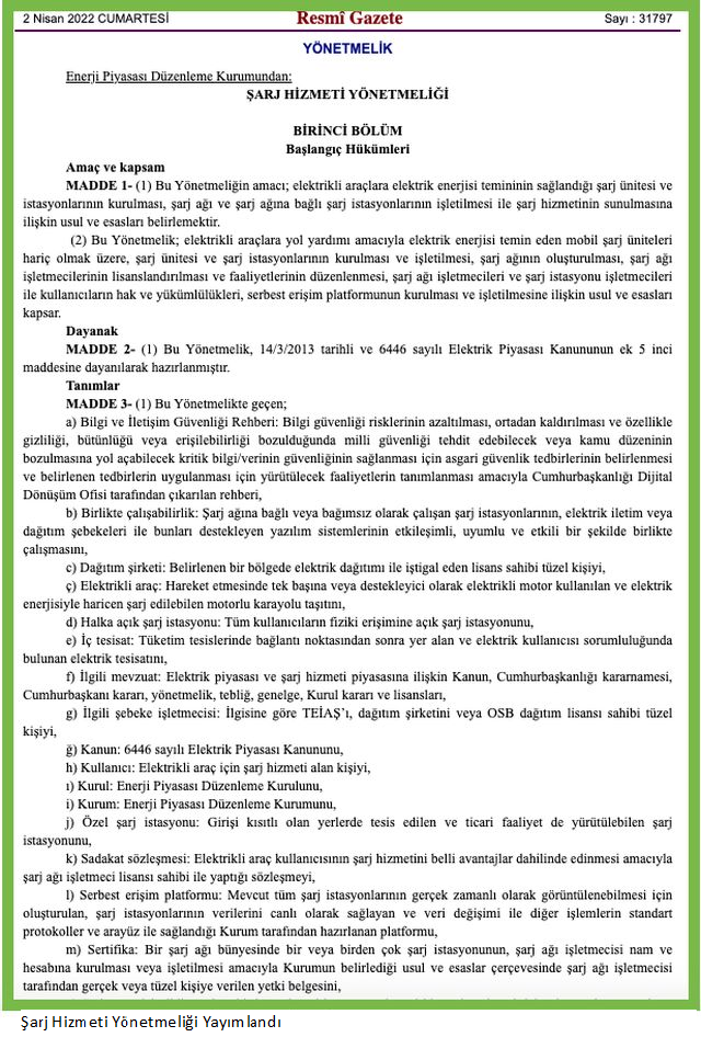 Haberler > Ekipman Başlıkları Elektrikli araçlar için "Şarj Hizmeti Yönetmeliği" Yayımlandı![]() Elektrikli araçlara yönelik “Şarj Hizmeti Yönetmeliği” yayımlandı. Bu yönetmeliğe göre, şarj ağı işletmecisi, lisansının yürürlüğe girdiği tarihten itibaren 6 ay içinde en az 50 adet şarj ünitesinden ve en az 5 farklı ilçedeki şarj istasyonundan oluşacak şekilde şarj ağını oluşturacak.Enerji Piyasası Düzenleme Kurumunun (EPDK) “Şarj Hizmeti Yönetmeliği”, Resmi Gazete’de yayımlandı. Bir süredir üzerinde çalışıldıktan sonra yayınlanan yönetmeliğe göre; şarj ağı işletmeciliği yapacak olanlar EPDK’dan şarj ağı işletmeci lisansı alacaklar. Alınan lisans daha sonra devredilemeyecek. Lisans alabilmek için gerekli koşullar EPDK internet sitesinden duyurulacak.Hangi şirketler şarj istasyonu açabilecek ve 49 yıllık lisans alabilecek? Mevcutlar 4 ay içinde yönetmeliğe uyum sağlayacak düzenlemeleri yapmak zorunda kalacak.Sabancı/EnerjiSA ve Vestel/ZES, ABB, Voltrun başta olmak üzere BMW, Mercedes ve Porsche gibi otomotiv şirketlerinin kendilerinin de şarj üniteleri bulunuyor.Bu koşullar arasında başvuru yapacak tüzel kişinin Türk Ticaret Kanunu’na uygun kurulmuş limited veya anonim şirket olması gerekiyor. Kamu iktisadi teşebbüsleri tarafından yapılan başvurular hariç; asgari sermayesinin kurulca çıkarılan usul ve esaslara göre belirlenen tutardan az olmaması gibi ek şartların yerine getirilmesi gerekiyor.Lisans en fazla 49 yıla kadar alınabilecek. Lisans süresi süre bitiminden başlamak üzere uzatılabilecek.Şarj Hizmeti Yönetmeliği: 6 ayda 50 şarj birimi• Şarj ağı işletmecisi, lisansının yürürlüğe girdiği tarihten itibaren 6 ay içinde; asgari 50 adet şarj ünitesinden ve en az 5 farklı ilçedeki şarj istasyonundan oluşacak şekilde şarj ağı yatırımı yapmak zorunda.• Yeni yönetmelik şarj noktalarındaki AC ve DC yani hızlı ve normal şarj ünitelerine de belirleyici sınırlar çiziyor. Şarj ünitelerinin en az yüzde 5’i ile Karayolları sorumluluğu altındaki otoyollar ve devlet otoyollarında yer alan şarj ünitelerinin en az yüzde 50’sinin DC 50 kilovat (kW) ve üzeri güçteki şarj niteliğinde olması zorunlu olacak.• Şarj istasyonunun elektrik ihtiyacını karşılamak üzere Elektrik Piyasasında Lisanssız Elektrik Üretim Yönetmeliği kapsamında; yenilenebilir enerji kaynaklarına dayalı elektrik üretim tesisi ile; Elektrik Piyasasında Depolama Faaliyetleri Yönetmeliği kapsamında da şarj istasyonu bünyesinde tüketim tesisine bütünleşik elektrik depolama tesisi kurulabilecek.Yönetmeliğin yürürlüğe girdiği tarihten itibaren 4 ay içerisinde şarj hizmeti sağlayan kişilerin kendilerini bu yönetmeliğe uygun hale