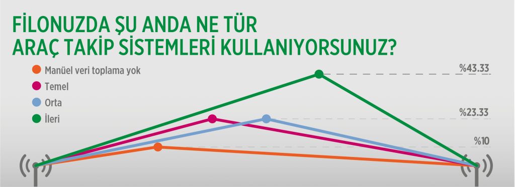 Anket örneklemi filo takip araçlarının artık yaygınlaştığını gösterdi. Sektör, ankete katılan filoların büyük bölümünde (yüzde 43) yakıt tüketiminin ve diğer faktörlerin filonun tek ekrandan sürekli olarak izlenmesine imkan sağlayan gelişmiş sistemlerin kullanıldığı bir noktaya ulaştığını gösteriyor. Filo yöneticileri kesintisiz çalışma ve verimlilik için hem filolarının hem de sürücülerinin proaktif şekilde yönetilmesini sağlamak zorunda olduğu belirtilen araştırmada, “Araç takip sistemlerinin kullanımı arttıkça performans yükselecek ve genel olarak endüstri standartları yükselecektir” ifadelerine yer verildi.